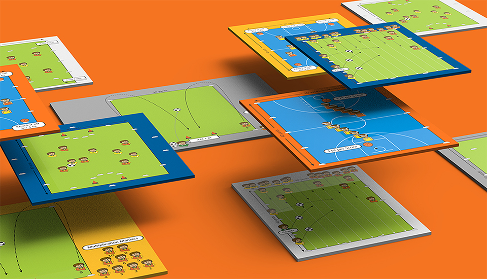 A comprehensive coaching manual composed of colorful visuals, content and diagrams that easily trains the SFL coaches on the after school sports program. The manual is sectioned by the brand colors, navy blue, orange, and a neutral gray.